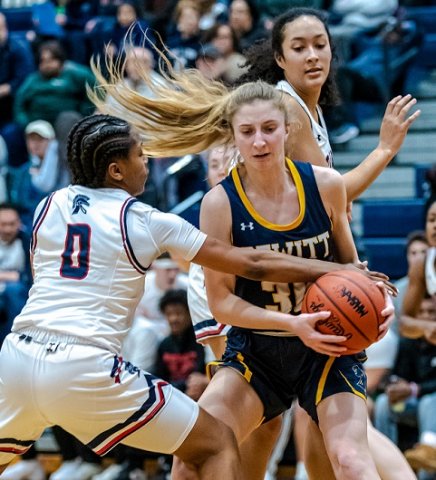 For six of the Trojan girls, Senior Night would be their last opportunity to play a game on their home floor. Aaliyah Nye and Sanaya Gregory combined for 31 points in their 81st win together as four-year starters, and on this night helped East Lansing break free from a DeWitt team that had tied the game at 35 with 3:17 left in the third quarter.