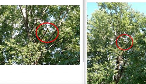 At today’s hearing, Kleiman told the judge that Friday’s storm had “damaged” a “relatively large limb” of the maple in question, causing branches to fall on BWL’s lines. He produced a photo allegedly showing this, but attorney Greg McClelland, representing Crittenden, told the judge Crittenden said there was no significant damage to the tree from the storm. I asked Kleiman to send me the photo, which he did. On the left is the photo he showed the judge, and on the right, the photo from which the portion was cropped, which Kleiman also provided to me.