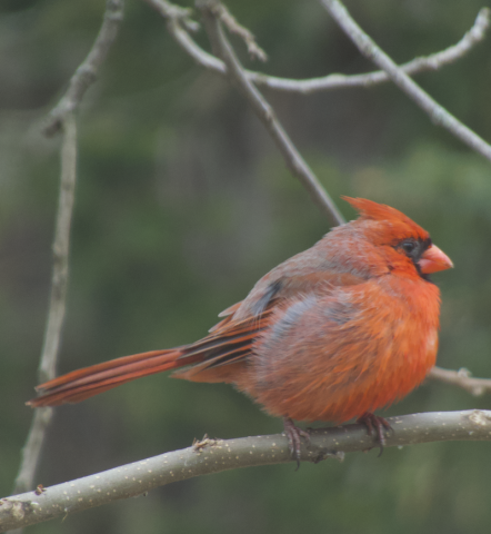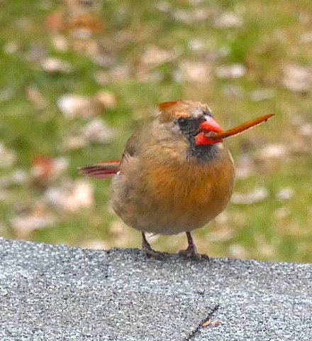 "Doves aren’t the only ones who are getting busy. A cardinal pair also was active in my yard. The male (above) was keeping a close eye on a female who was collecting sticks for a nest (below)."