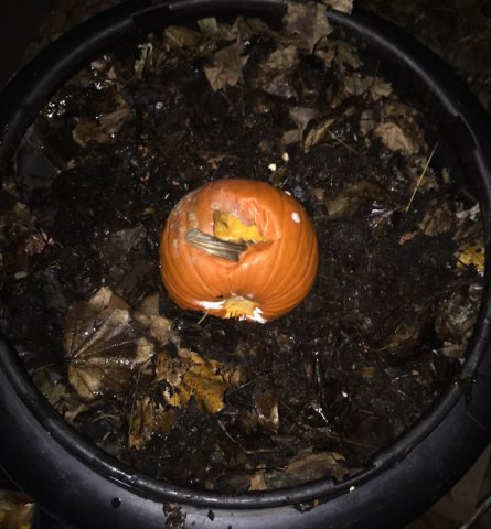 Above: A pumpkin rots in a compost bin in a photo by Joel Kuszai.