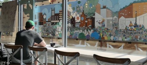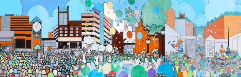 “I just painted the feel of the city,” Van Dyke said. “It’s the art fair, the outside music events, the Homecoming Parade, familiar faces and people like the juggler from street fairs. It’s just all those happy times.”