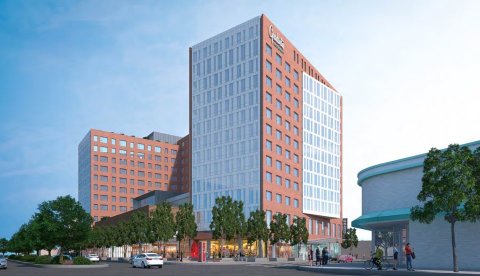 According to the staff report on the project, “The developer has communicated to City staff that the additional building height is necessary due to the use of space for the public plaza which reduces the typical floor plate. In order to achieve the hotel room and dwelling unit counts and area necessary for the development, additional floors are required to compensate for the lost area. In addition, accessory parking for the hotel guests and residents is being satisfied on site and within the building which adds approximately 20 feet to the total building height.”