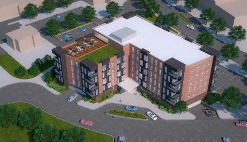 In this drawing, at the upper-right is Peoples Church, and in the foreground is Valley Court Drive, with the lower-left showing a portion of Valley Court Park. The plans for this building call for 27 studio apartments, 17 one-bedroom units, 18 two-bedroom units, and 4 three-bedroom units. As shown, there is a rooftop terrace designed for use by residents.