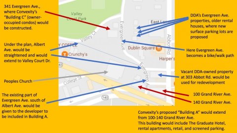 Under the current proposal by Convexity, the properties now currently occupied by older rental houses (328, 334, and 340-344 Evergreen Avenue) would be turned into surface parking lots. It looks as if the plan will be to use tax increment financing to pay off the DDA’s debt, demolish the houses, and turn the land into surface parking lots. The DDA has had preliminary discussion about putting out a Request for Proposals for redevelopment of these surface parking lots after major downtown projects now under consideration are completed, so surface parking is in all likelihood seen as a relatively short-term use of this land.