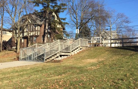 The land the developer wants to use includes the steps that go up from Evergreen Avenue to Parking Lot 15 as shown here (above).