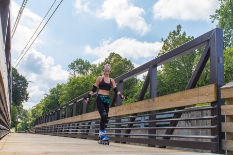 An inline skater crosses the Kalamazoo Street bridge east of Clippert Street along the River Trail.
