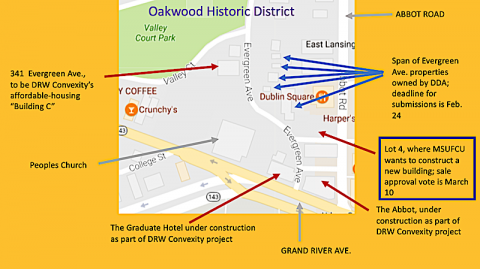 At that meeting, representatives of MSUFCU, Council members, and City planning staff are expected to discuss details of the deal, which involves the parking lot just south of Dublin Square at the northwest corner of Abbot Road and Albert Avenue. The public can also weigh in.