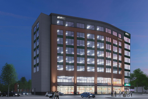 The new renderings show an 8-story office building with a credit union branch on the first floor, in keeping with the previously-described plans. The credit union anticipates possibly renting out some of the upper-floor space to another office-user tenant for the first few years.