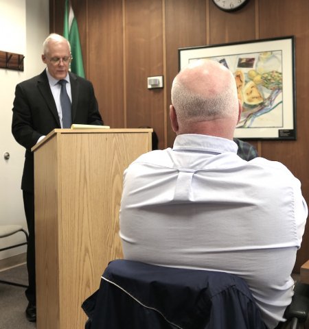 Below: DDA Chair Peter Dewan listens to Brent Titus at yesterday's meeting.