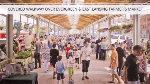 His handouts (shown in part above and below) imagined a “public market” apparently based on those in Grand Rapids, Detroit, or Ann Arbor.