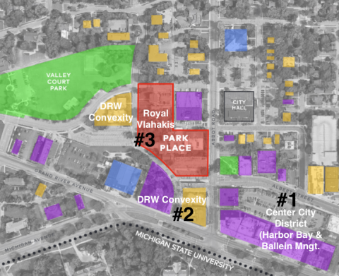 Above: The approved DRW Convexity project (A, C, D) rendered here as if from above the MSU Union looking northwest. Building A's construction has just started. If approved, the Royal Vlahakis project would add a pair of tall buildings just north of  Buildings D and A.