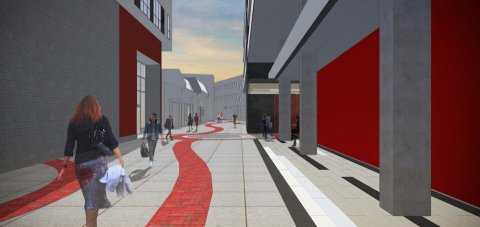 Above: New "alleyway perspective" provided by Harbor Bay Real Estate showing the revamped alley behind the Grand River Avenue buildings in the proposed Center City District project.
