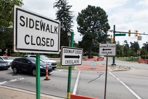 Zachary Neal, a resident of the Glencairn neighborhood, faced several street detours as he tried to make his way on foot safely across the busy roadway.