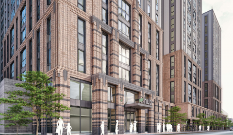 Above: Rendering of the existing Hub tower to the left and proposed towers to the right, looking southeast.