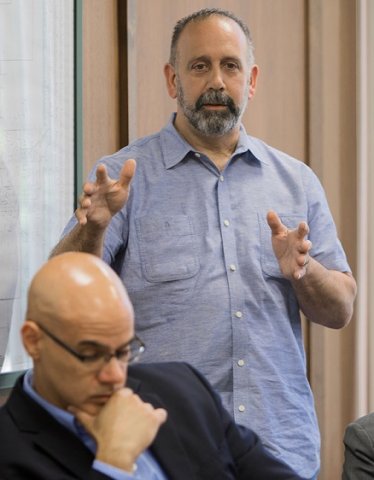 With City Manager George Lahanas in the foreground, developer Paul Vlahakis addresses the Downtown Development Authority at its meeting on August 22. (Photo by Raymond Holt)