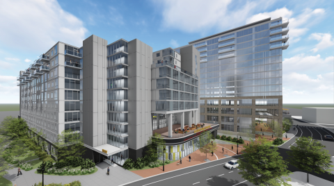 The image above shows what Royal Vlahakis wants to build along Evergreen Avenue, seen as if from above the tennis courts at Valley Court Park. Evergreen Avenue along the west side of the building would be turned into a greenway.
