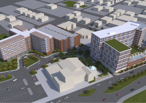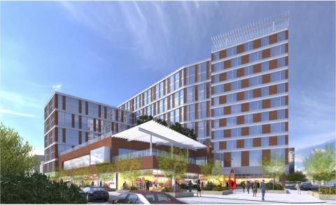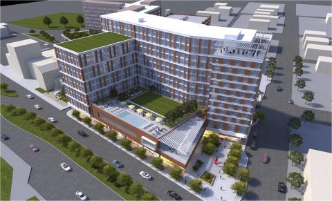 Building A is expected to feature a hotel as well as apartments targeted at a mixed market. The southwest wing of the building, which fronts Grand River Avenue, will be residential, and the north wing, standing two stories taller, will be part of the hotel.