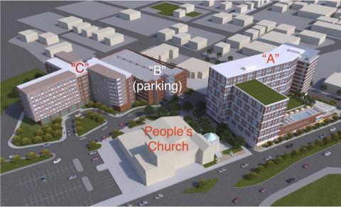 The parking garage is not just important so that future residents have a place to park, but also because the development will eliminate parking now used by the Peoples Church and nearby businesses. If you compare the architect’s map above with the aerial map below, you can see that the parking lot behind Peoples Church, as well as some street parking, will be eliminated to make way for new buildings and private drives.