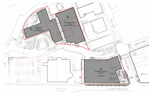 The current design of Building A calls for pull-up entry to the hotel on the west side of Abbot Road and entry to the hotel’s parking from the north side of Grand River Avenue. At present, left turns are not allowed onto Albert Avenue from Abbot Road traveling north from Grand River Avenue, all of which makes it effectively impossible for cars coming from the west to get directly to the building’s drop-off areas or parking areas.