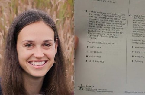 In the first tweet, Graham included a photo of a test from Texas. The lower-hand right side of the image indicates a copyright of the test. Graham explains in the response reproduced below that the image was not taken by her and was in wide media circulation when she posted it. She says she did not violate copyright or breech test security.