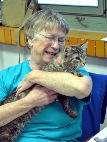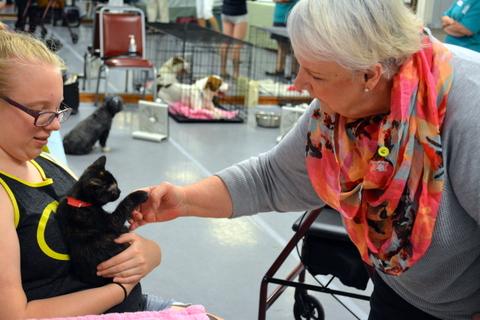 Above: Linda Saloff, 69, of East Lansing had never petted a kitten before because of a lifelong fear of cats. She overcame that fear at the Senior Pets for Senior People event Friday, stroking three-month-old Letty as she was held by Sydney Babcock, 16.