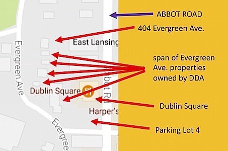 There’s been no site plan submitted for the proposal, but the project has been described as including the Dublin Square property along with the DDA-owned Evergreen Avenue properties (below). The developers want to put a 12-story building along Evergreen Avenue near Valley Court Park, and another 12-story building along Abbot Road, where Dublin Square now stands. (Read more.)