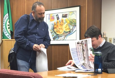 Above: Paul Vlahakis (left) and East Lansing staff Tom Fehrenbach at a DDA meeting last month.