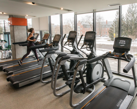 The gym offers standard equipment such as weights, treadmills, and ellipticals, but a special room is also available for residents to select and complete workout routines from an electronic cache of videos. After a workout, Hub residents can relax in either the steam room or sauna.