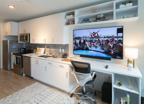 On our tour, Hotz showed us two model furnished studios that The Hub maintains. We entered a room fully lit with the television running on a loop, showing various properties across the United States owned and operated by The Hub’s parent company, Core Spaces.