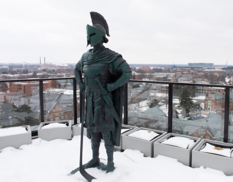Above: The hot tub on the roof of the Hub, and Sparty standing guard (photos by Raymond Holt)