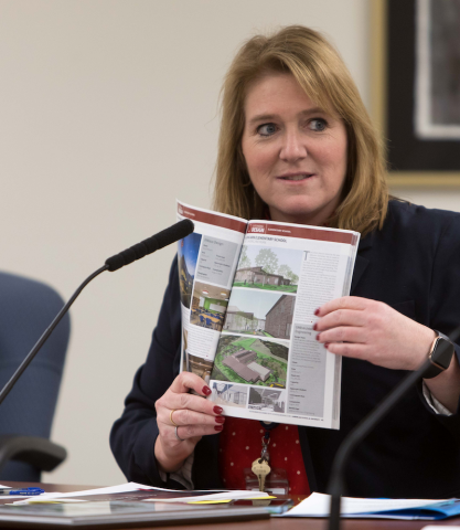 ELPS Superintendent Dori Leyko holds a copy of American School & University magazine’s story about the new Glencairn Elementary building at the January 27 Board of Ed meeting. (Photo by Raymond Holt)