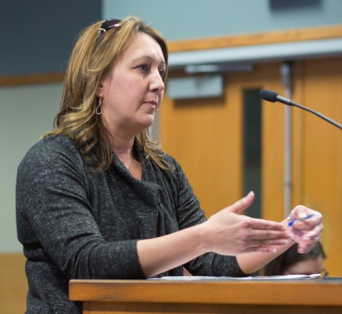 Above: Jill Feldpausch presents the forecast to City Council (photo by Raymond Holt)