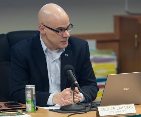 Above: City Manager George Lahanas at the February 18 Council meeting (photo by Raymond Holt)