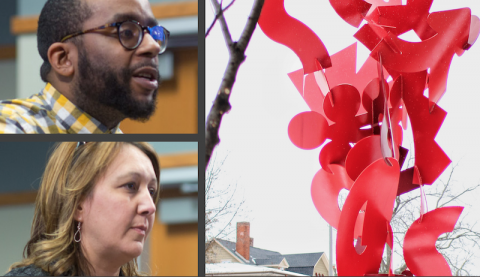 Above: Income Tax Administrator DaMar Boyd (top) and Finance Director Jill Feldpausch (photos by Raymond Holt) and the sculpture outside City Hall (photo by Gary Caldwell).