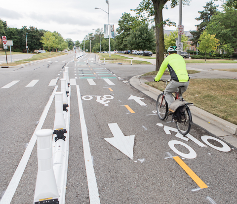 During the fall 2019 semester, MSU ran a pilot program, implementing a two-way bike lane on Bogue Street. Plastic barriers separated bicyclists from motorized traffic, but eliminated a lane of southbound motorized traffic.