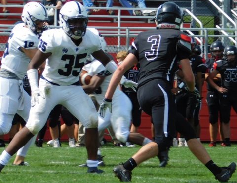 East Lansing junior linebacker/tight end Sebastian Smith (35), pictured here against St. Johns on Aug. 30, contributed seven tackles on defense during Friday's 42-3 victory over Grand Ledge.