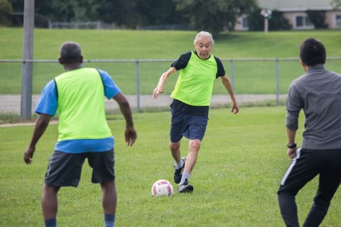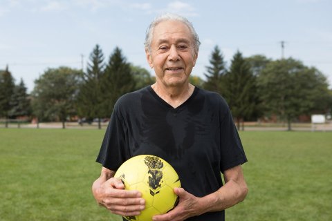 Seventy years later, the 80-something anthropologist and scholar plays soccer in casual American sportwear and athletic shoes in a setting far removed from the cobblestone streets and mountainous terrain of his homeland.