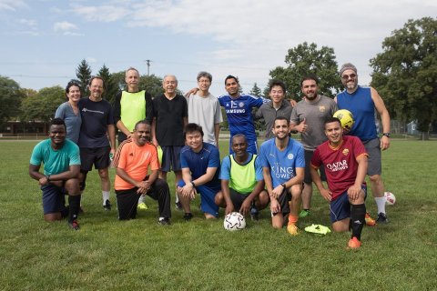 Members of the Sunday Coed Friendly Soccer group assemble for a picture before the 10 a.m. scrimmage. Jamil Hanifi is pictured fourth from the left, back row.