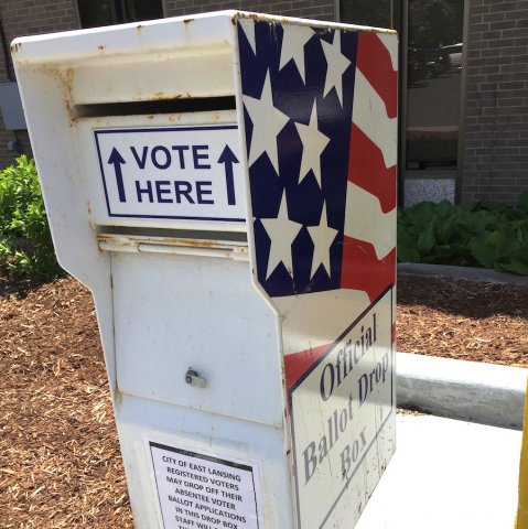 Above: The absentee vote drop-off box outside East Lansing’s City Hall.