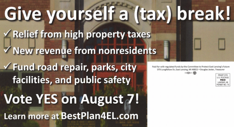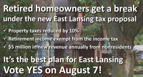 The official ballot committee urging a “yes” vote on an income tax for East Lansing has produced a mailer targeted at East Lansing homeowners who are retired. The mailer (shown below) encourages retirees to “Give yourself a (tax) break!” by voting yes on the income tax.
