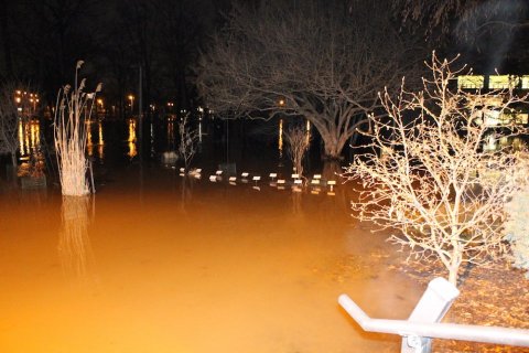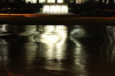 On campus, the scene along the river is quite dramatic. The weir near the MSU Administration Building, which usually has a thin layer of water flowing over it and ducks hanging around it, is now completely submerged. This photo was taken Wednesday night and shows the scene looking across the river to the Administration Building: