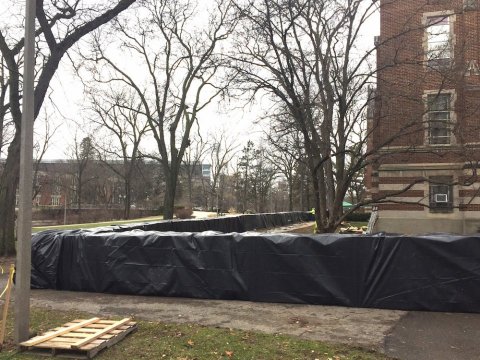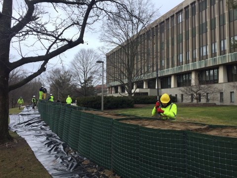 Crews have constructed sand-filled barriers, wrapped in black tarp, around the Administration Building and the Computer Science Building.