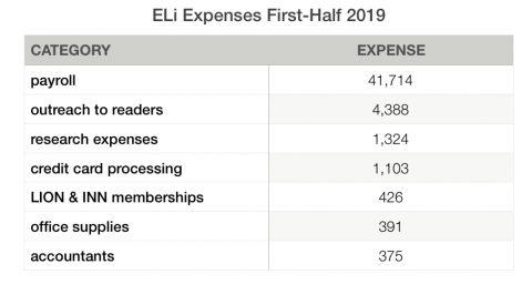 When supporters donate via check, that’s cost-free to ELi. When they donate using credit cards via PayPal, GiveGab, or Patreon, we pay processing fees. We spent $1,103 on credit card processing fees in the first-half of 2019. (We’re now shutting down our Patreon donation system because it is by far the most expensive and their accounting methods also cause us headaches.) If you want to see your donation options, just click here.
