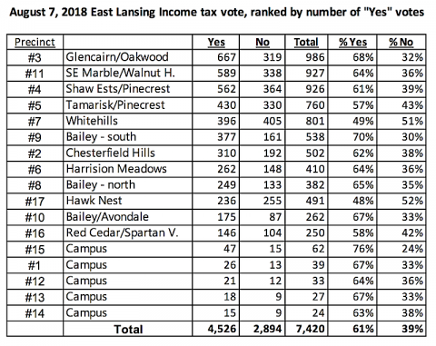 Results are in from the vote on the East Lansing income tax ballot question on August 7, so we can now analyze where the votes came from to pass that East Lansing City Charter Amendment. Over all, 61% of people voting on the income tax voted “yes,” with 39% voting “no” – a decisive vote in favor, as we reported on election night.