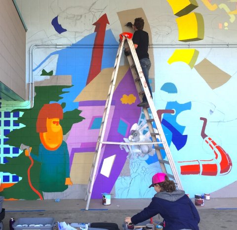 Near where DeLind will be working, festivalgoers can see another new mural being created, a collaboration between the Downtown Development Authority (DDA) and the MSU Department of Art and Art History. Each year, for the next four years, a team of graduate and undergraduate students will have the opportunity to conceive and paint a mural on the north-facing outside wall of the Division Street Garage. Each year’s mural will respond to and extend the mural from the one before.