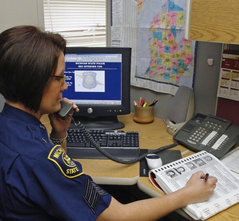 Photo by Raymond Holt of a Michigan State Police officer working on the sex offender registry.