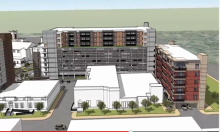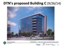 Image above: Plan rendering provided by DTN, looking west across Abbot Road from above City Hall toward Valley Court Park. The largest building is a planned 7-story parking ramp with a 10-story building wrapped around it. (This does not show the entire Park District area plan.)