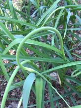 Garlic, Allium sativum, is a bulbous plant easily grown in East Lansing gardens and common at the farmer stalls at the East Lansing Farmers Market in the spring and early summer. While the whole plant is edible, most people eat the mature bulb, which is formed from 6-10 cloves divided by a papery skin. In the next few weeks, garlic bulbs should be ready for harvest.